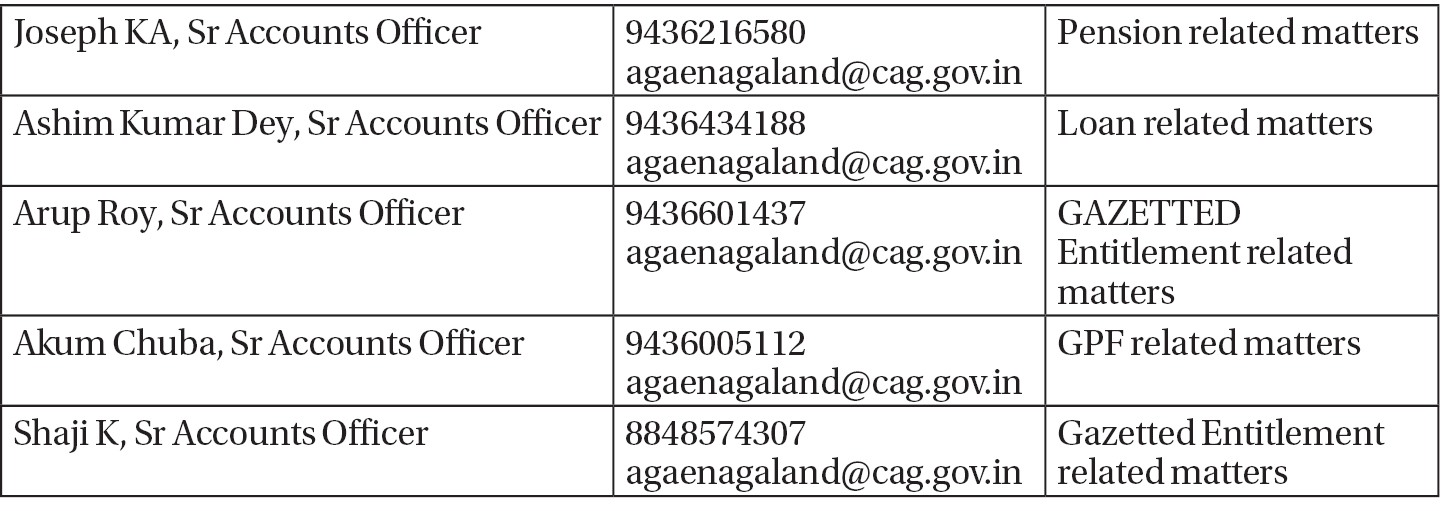 Aggrieved pensioners or Government officials facing genuine problems with regard to settlement of any entitlement benefits are requested once again to write directly to Uttam Chanda, Deputy Accountant General (A&E) via e-mail at chanda.u@cag.gov.in or agaenagaland@cag.gov.in or through a handwritten letter. They may also contact the Grievance Redressal and Feedback Committee.