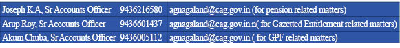 Aggrieved pensioners or government officials facing genuine problems with regard to settlement of any entitlement benefits have been requested to write directly to Uttam Chanda, Deputy Accountant General (A&E) via e-mail at chanda.u@cag.gov.in or agaenagaland@cag.gov.in or through a hand written letter. They may also contact the Grievance Redressal and Feedback Committee, the office informed. All Heads of Departments have also been requested to provide mobile numbers of retirees in their Pension application form and GPF final Payment application form for receiving SMS service regarding status of their Pension and GPF final payment.