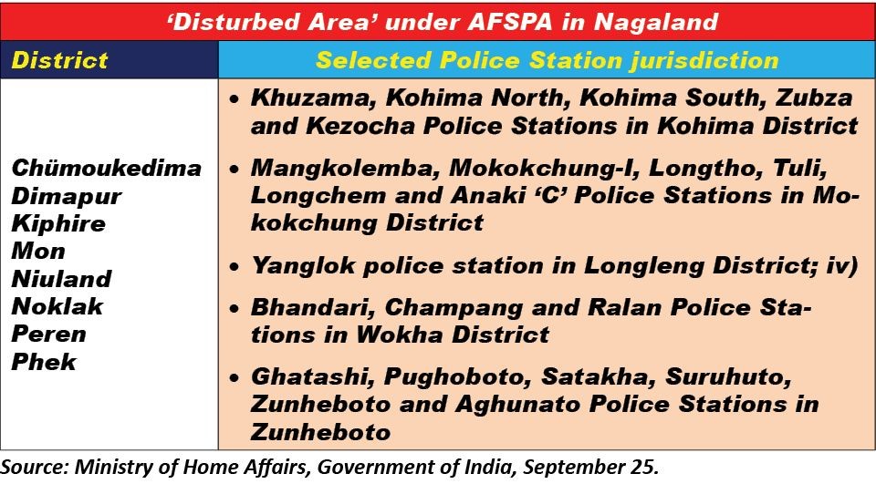 DIMAPUR, SEPTEMBER 26 (MExN): The Ministry of Home Affairs has declared the extension of the Armed Forces (Special Powers) Act, 1958 (AFSPA) in eight districts of Nagaland, along with various police stations in five other districts. The notification, dated September 25 states that the areas will be categorized as "disturbed areas" for six months starting October 1 as per the powers granted under Section 3 of the AFSPA.