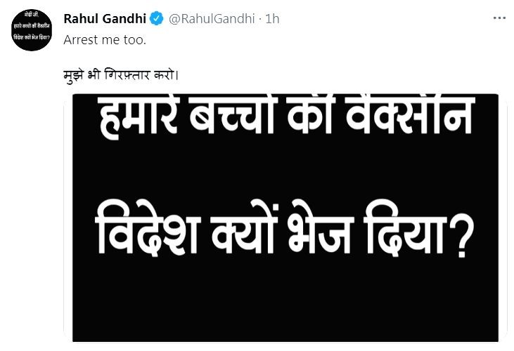 Tweeting the poster on Sunday, Rahul Gandhi said: "Arrest me too." Meanwhile, Congress leaders, targetting the government, are putting up a social media campaign.