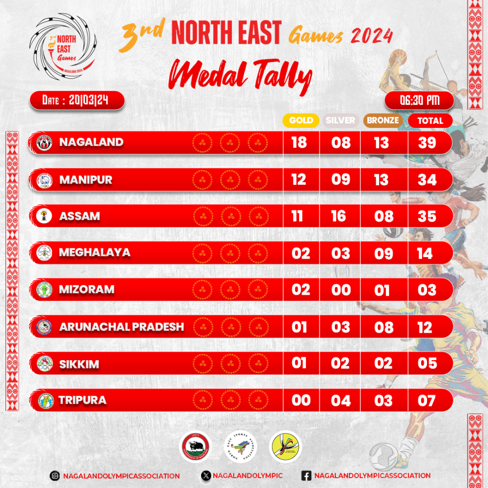 DIMAPUR/KOHIMA, MARCH 20 (MExN): Nagaland's athletes demonstrated remarkable skill and determination on the second day of the 3rd North East Games 2024, securing a total of 39 medals. This exceptional performance, comprising 18 Gold, 8 Silver, and 13 Bronze medals has propelled Nagaland to the top position in the medal standings for the second consecutive day.