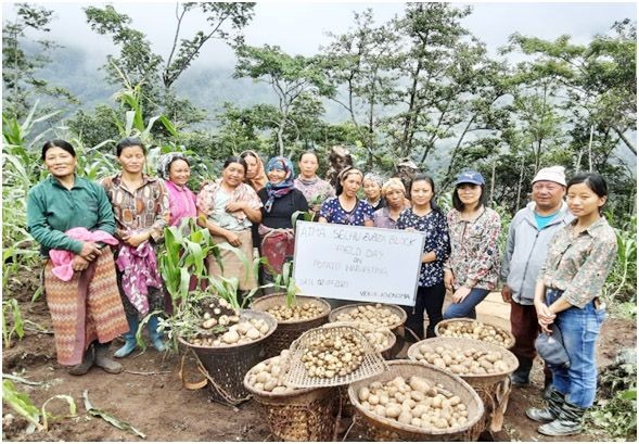 The event was attended by the members of a Farmers’ Interest Group (FIG) from the village, along with Farmer’s Friend and ATMA functionaries. The programme involved harvesting of potatoes at a farm belonging to the adopted ‘Kevichi’ FIG of Khonoma village, followed by demonstration on nursery bed preparation of cabbage, carrot and coriander.