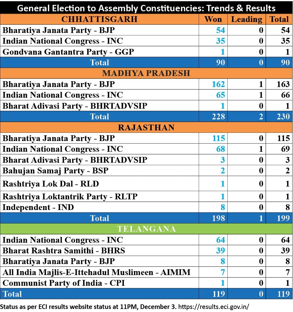 According to official information available from the Election Commission of India on Sunday evening, in Chhattisgarh, the BJP had won 54 seats out of 90, while the Congress tally fell to 35. The remaining seat went to the Gondvana Gantantra Party.