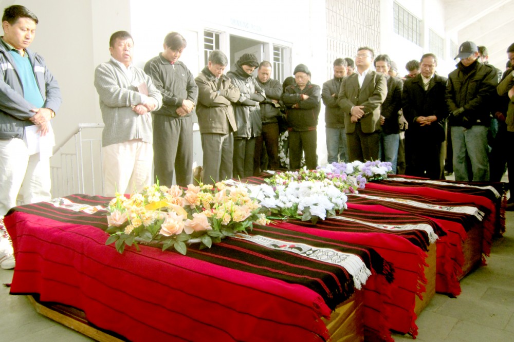 Keviyiekielie Linyü (2nd from left), executive director, Angami Baptist Church Council is seen here leading the prayer during a funeral service organized by the Kohima Village Students’ Union (KVSU) for the four victims of ‘carbon monoxide poisoning’ at the IG stadium premises on January 5 afternoon. (Morung Photo)