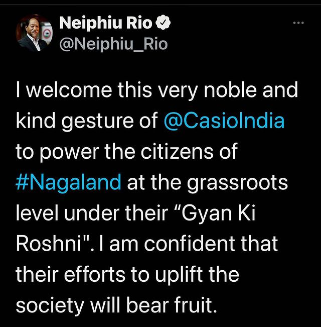 Meanwhile, Nagaland’s chief minister Neiphiu Rio twitted as” I welcome this noble & kind gesture of @ CasioIndia to power the citizens of #Nagaland under their Gyan Ki Roshni. I am confident that their efforts to uplift the society will bear fruit.”
