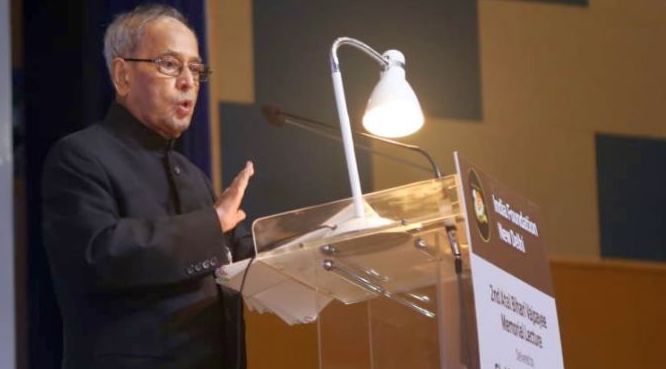 Former president Pranab Mukherjee delivers the second Atal Vihari Vajpayee memorial lecture in New Delhi. Photograph: @CitiznMukherjee/Twitter