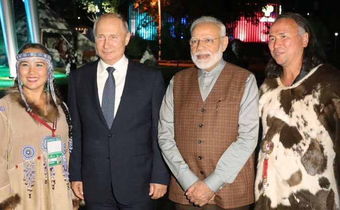 Russian President Vladimir Putin and Prime Minister Narendra Modi pose for a picture with participants while touring an exhibition on the sidelines of the Eastern Economic Forum in Vladivostok, Russia, on Wedne