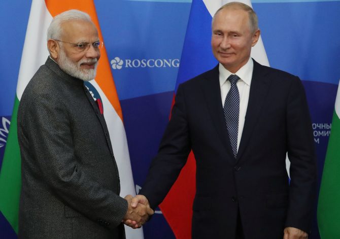 Russian President Vladimir Putin shakes hands with Prime Minister Narendra Modi during a signing ceremony following their talks on the sidelines of the Eastern Economic Forum in Vladivostok on Wednesday. Photog