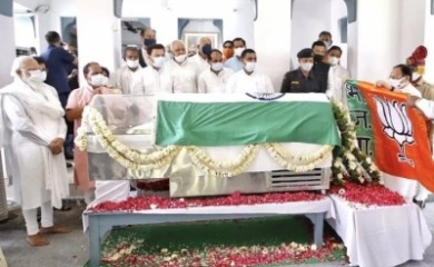 Lucknow, August 23 (IANS): A photograph of the BJP flag placed over the national flag on the mortal remains of late Uttar Pradesh Chief Minister Kalyan Singh has kicked up a controversy on social media.