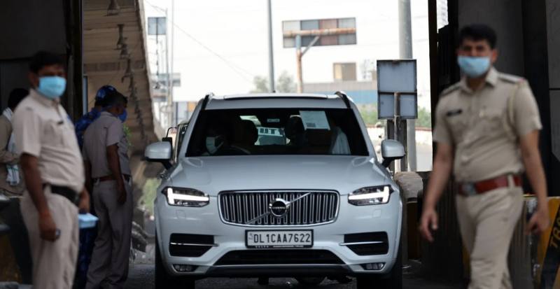 A police officer checks the ticket of a migrant family to board a bus to reach a railway station, after a limited reopening of India's giant rail network following a nearly seven-week lockdown to slow the sprea
