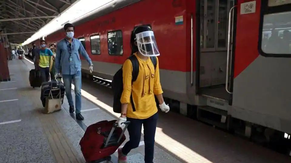People wearing protective masks wait outside a railway station to board trains that will take them to their home states after India announced a limited reopening of its giant rail network following a