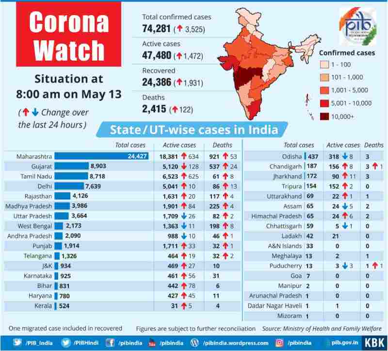 With 3,525 new cases reported in the last 24 hours, the COVID-19 tally in India reached 74,281, the Union Health Ministry said on Wednesday. Of the total cases, 47480 are active and 2,415 are fatalities so far