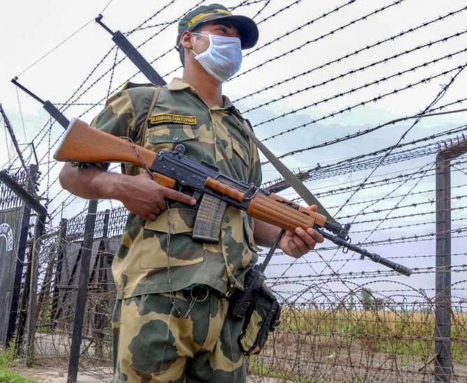 A Border Security Force soldier wearing a mask stands guard near the fence of a field at Rajatal village, near Indo-Pak border about 40 km from Amritsar. Photograph: PTI Photo
