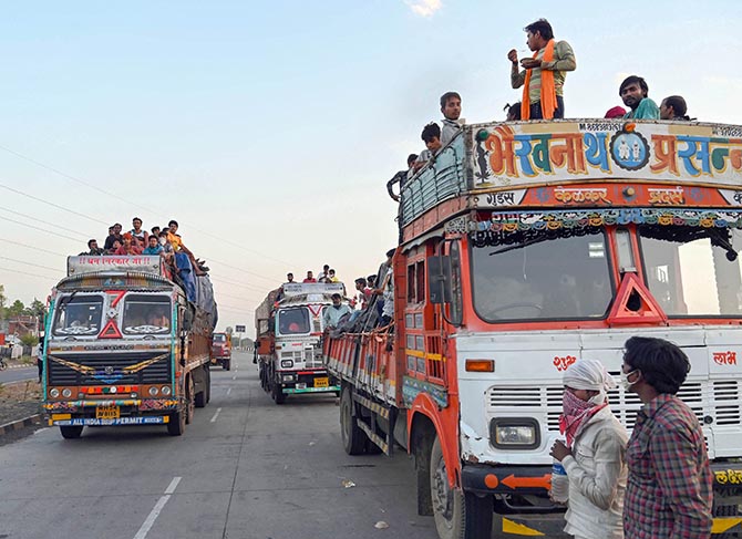 Migrants travel on trucks to reach their native places, during the ongoing COVID-19 nationwide lockdown, in Jabalpur, Thursday, May 7, 2020. (PTI Photo)