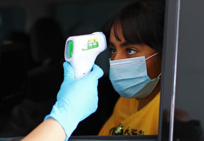 A member of medical staff wearing a protective gloves measures the temperature of a boy during drive-thru coronavirus disease testing at a screening centre in Abu Dhabi, United Arab Emirates. Photograph: Ahmed
