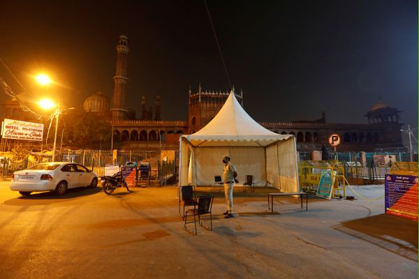 A police officer stands guard in front of the Jama Masjid (Grand Mosque) during an extended nationwide lockdown to slow the spreading of the coronavirus disease (COVID-19), in the old quarters of Delhi on April