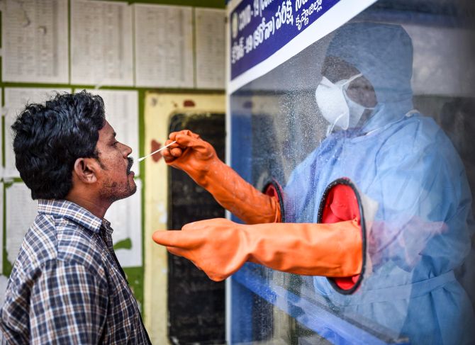 A healthcare worker collects a swab sample of a man for COVID-19 test from the swab collection booth during the nationwide lockdown in the wake of coronavirus pandemic, in Vijayawada, Saturday, April 11, 2020.
