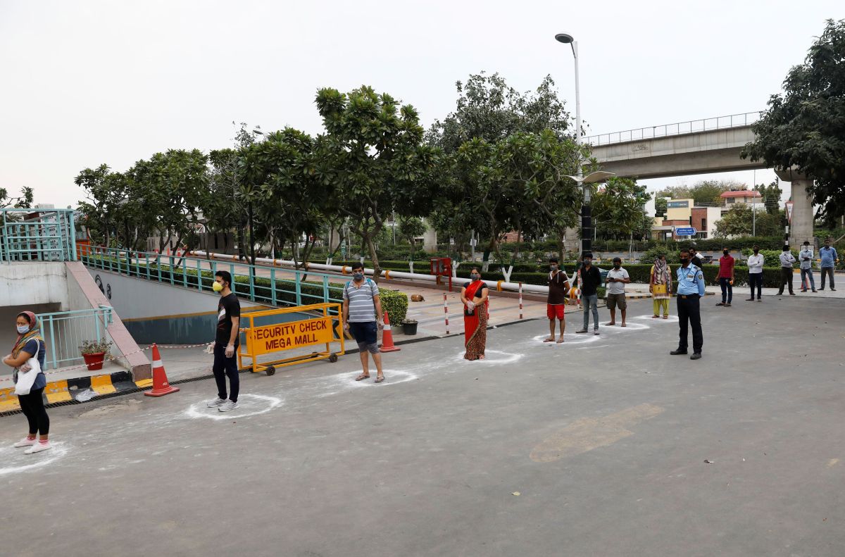 People queue standing in circles drawn with chalk to maintain safe distance as they wait to enter a supermarket during the coronavirus disease (COVID-19) outbreak in New Delhi, India, March 25, 2020. REUTERS/Ad