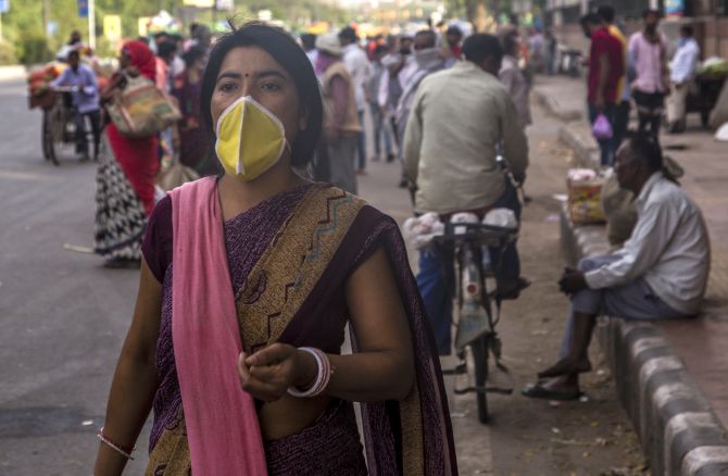 An Indian woman covering her face with a mask walks in a crowded market place, as nationwide lockdown continues over highly contagious novel coronavirus on March 26, 2020 in New Delhi, India. (Photo by Yawar Na