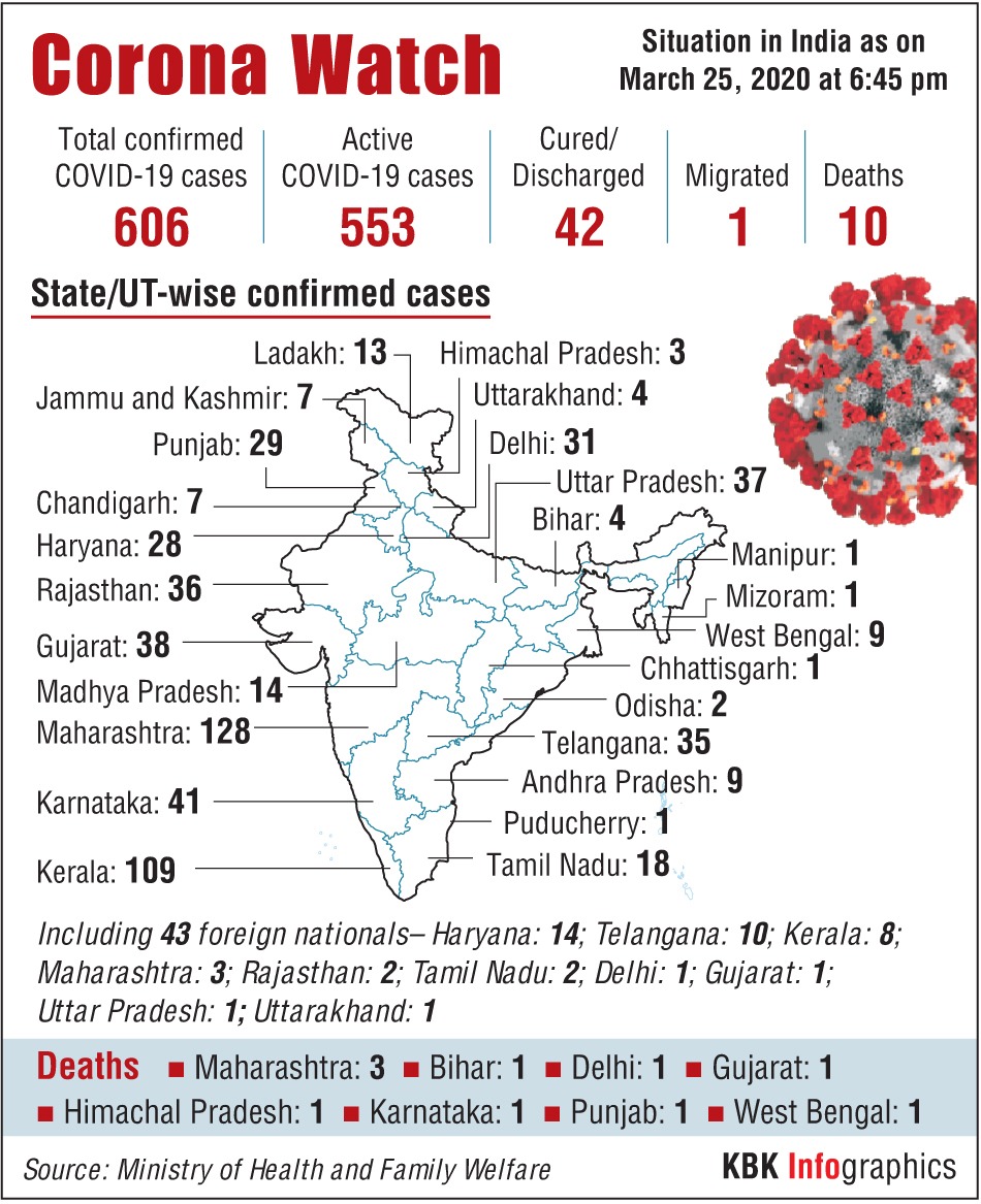 New Delhi, March 25 (IANS): There are at least 606 confirmed coronavirus cases in India as of Wednesday, the