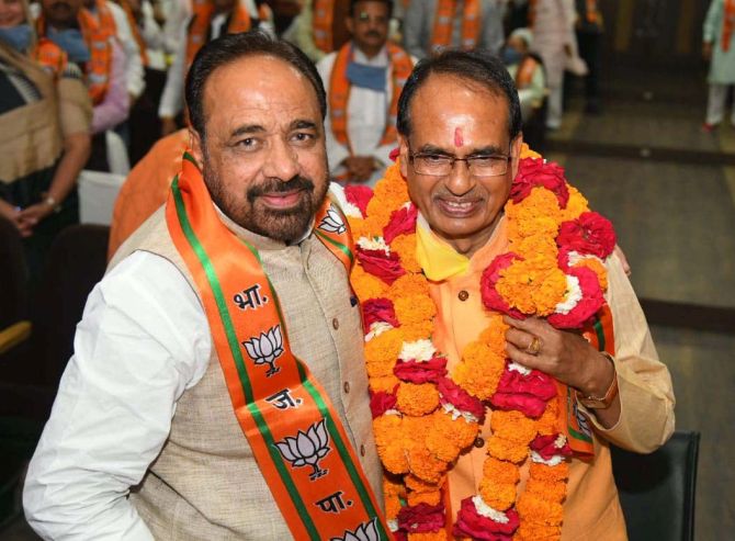 Former Chief Minister Shivraj Singh Chouhan (R) is being welcomed by party leader Gopal Bhargava after he was elected as the leader of BJP Legislative Party, in Bhopal, Monday, March 23, 2020. (PTI Photo)