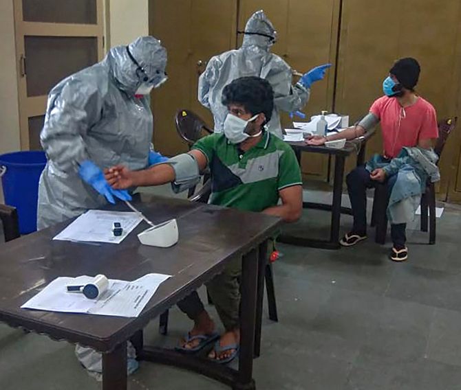Medics screen patients for COVID-19 at ITBP quarantine facility at Chhawla in New Delhi. Photograph: PTI Photo
