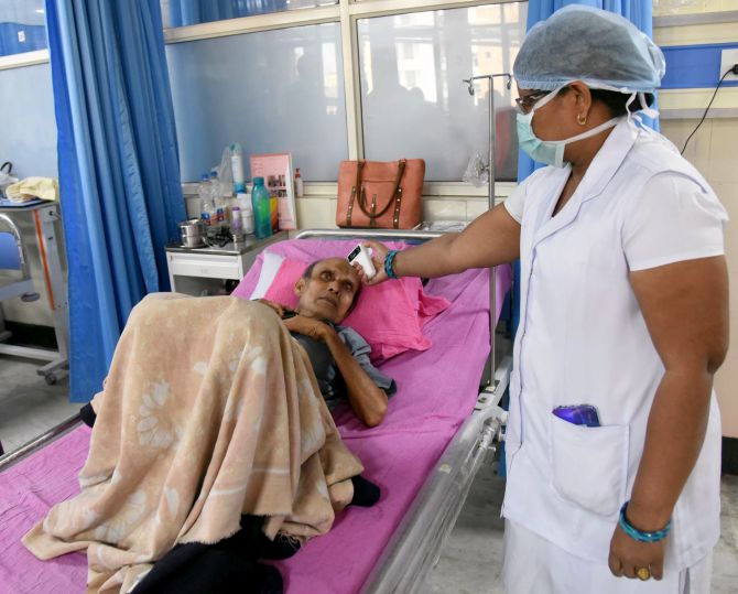 A nurse use thermal screening device on a patient at Railway hospital in the wake of deadly corona-virus,in Patna. Photograph: ANI Photo