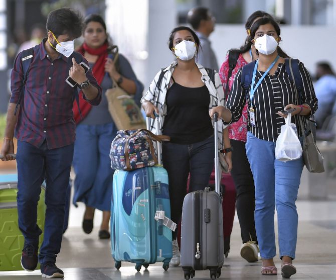 Passengers wear masks to mitigate the coronavirus pandemic at the airport in Chennai, Tuesday, March 17, 2020. Several flights have been cancelled due to the coronavirus outbreak. (PTI Photo/R Senthil Kumar)