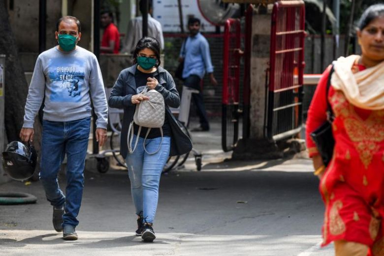 Pedestrians wearing face masks walking out of a government hospital with a special ward set-up for the coronavirus outbreak in Mumbai.PHOTO: AFP