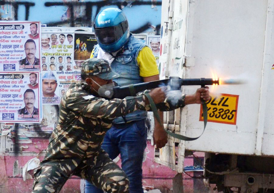 A police officer fires a tear gas shell to disperse crowds after a clash between people supporting a new citizenship law and those opposing the law, in Maujpur area of New Delhi on February 23. (REUTERS Photo)
