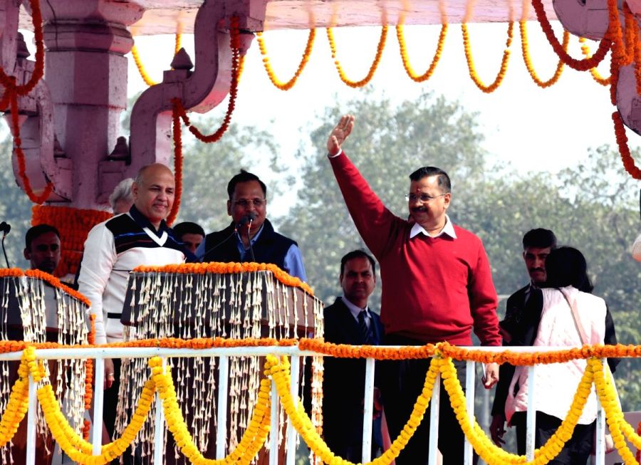 Delhi Chief Minister Arvind Kejriwal and his Cabinet Ministers Manish Sisodia and Satyendra Kumar Jain after taking oath at Ramlila Maidan in New Delhi on February 16. (IANS Photo)