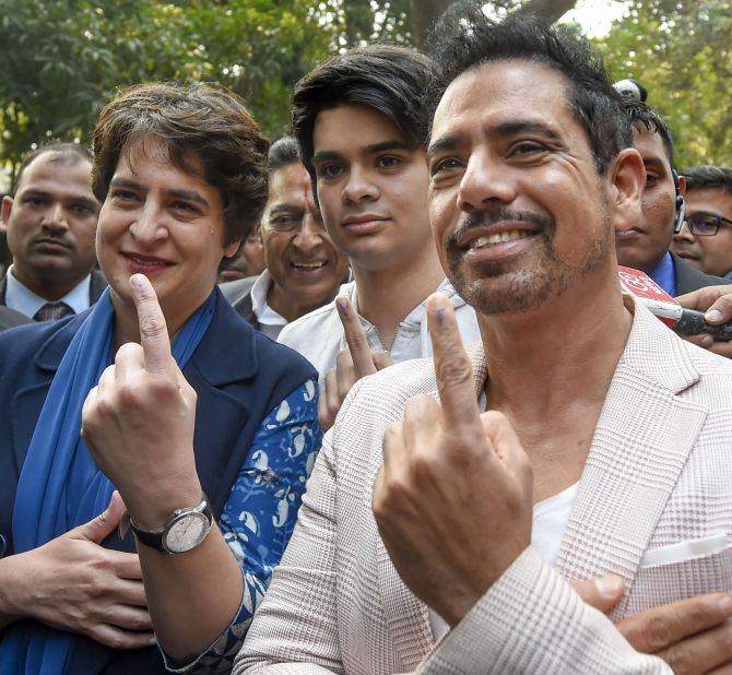 Congress general secretary Priyanka Gandhi Vadra along with her husband Robert Vadra (R) and son Raihan Vadra (C), who voted for the first time, show their finger marked with indelible ink after casting vote du