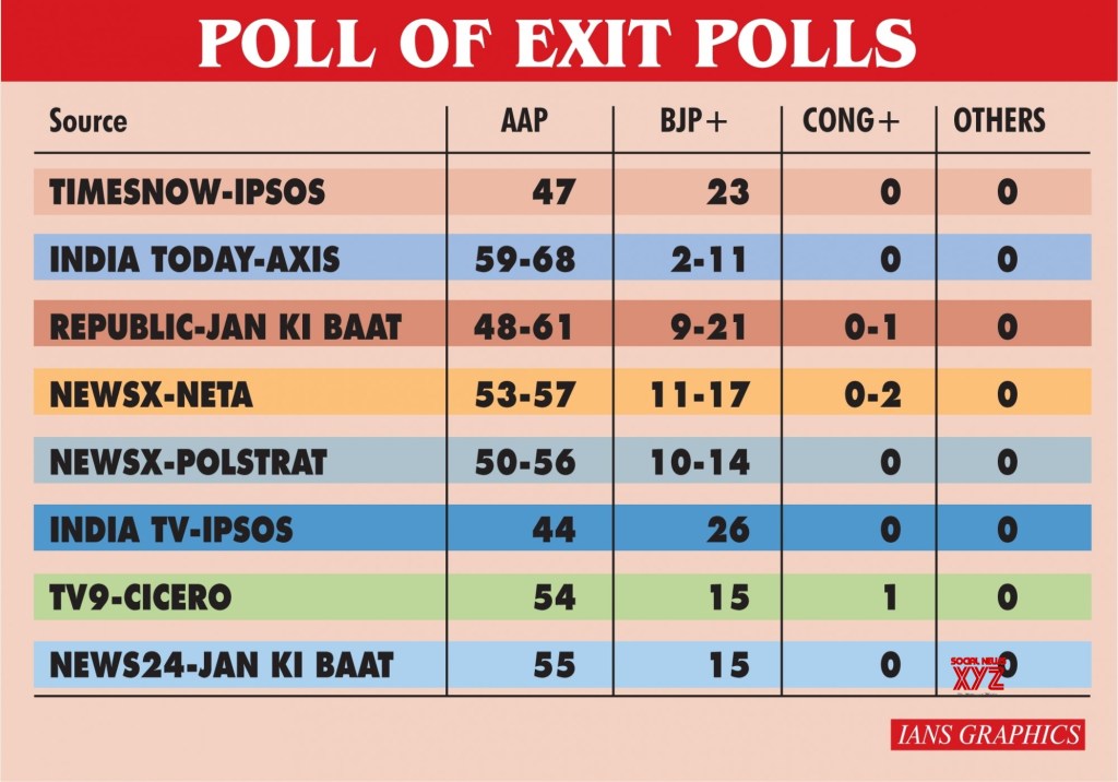 New Delhi, February 8 (IANS) The poll of exit polls suggest the ruling Aam Aadmi Party is all set to sweep back to power in Delhi. While some exit polls sugg