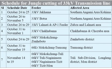 Kohima, October 20 (MExN): The Department of Power has informed that there will be intermittent disruption of power supply from October 24 to November 26 in various parts of the state.