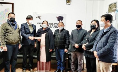 Kohima, January 22 (MExN): An ex gratia compensation of Rs 30 lakh was handed over to Thekhole-ü Thur, the wife of late Khrieliehu Thur, a booth level officer who died of COVID-19 while on election duty. N