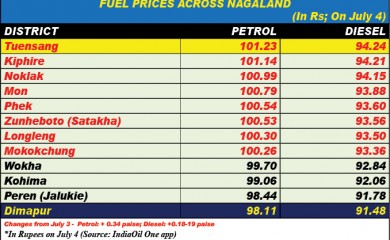 With fuel prices rising again for the second time this month, the retail price of petrol crossed the century mark in 8 districts of Nagaland on July 4.
