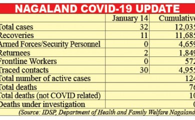DIMAPUR, JANUARY 14 (MExN): 32 new positive cases of COVID-19 were detected in Nagaland on January 14. Meanwhile 11 new recoveries were also recorded.