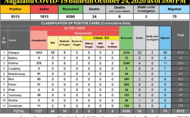 Dimapur, October 24 (MExN): Nagaland's COVID-19 tally rose to 8,515 on Saturday as 79 more people tested positive for the infection, the state Health and Family Welfare Department said.