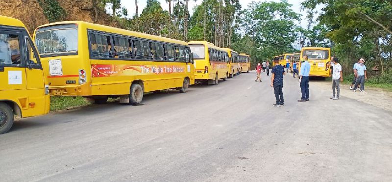 Seen are school buses arranged by the Ao Students Union Dimapur.