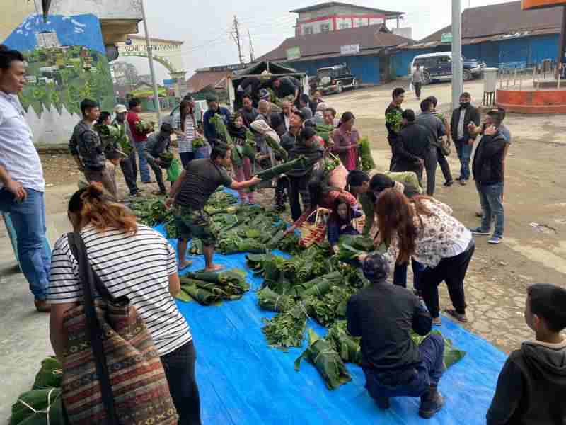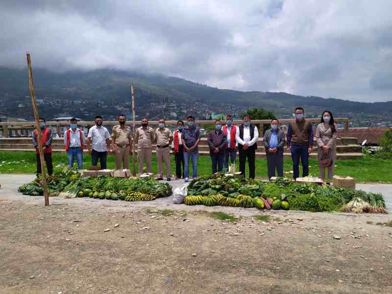 Wokha DC, Orenthung Lotha; Wokha CMO, Dr. CW Tungoe, administrative and police officials receiving the vegetables and fruits from village council members of Longsa and Wokha village at public ground Wokha Town.