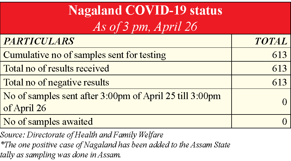 Kohima, April 26 (MExN): A total of 613 samples sent from Nagaland for COVID-19 testing have come back negative as of 3:00pm, April 26.