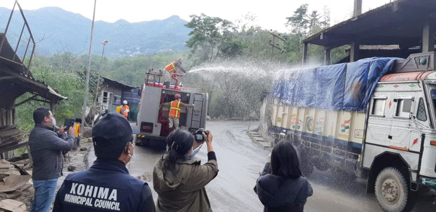 Ozukum and others inspect KMC toll tax gate where goods vehicles are being sanitized by KMC.