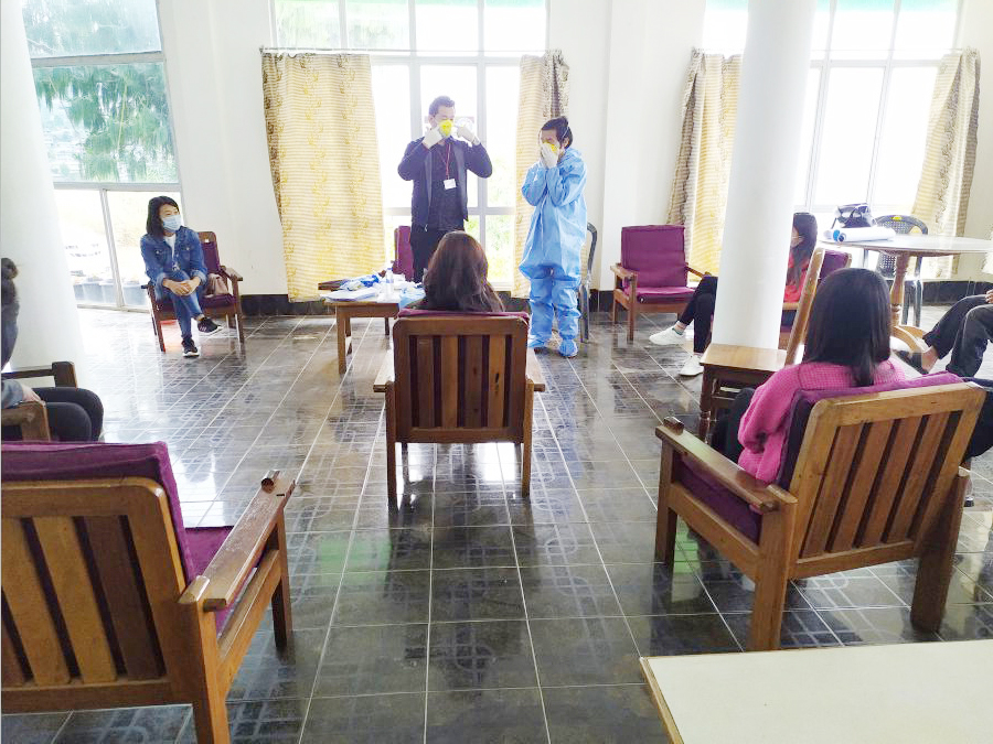 Dr Kuokholie Savino demonstrating the use of personal protection equipment to housekeeping staffs of quarantine place in Wokha town.