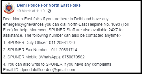 A screenshot of the message on the Official Facebook Page of Special Police Unit for North East Region (SPUNER). (Delhi Police For North East Folks @dpfne/ Facebook)