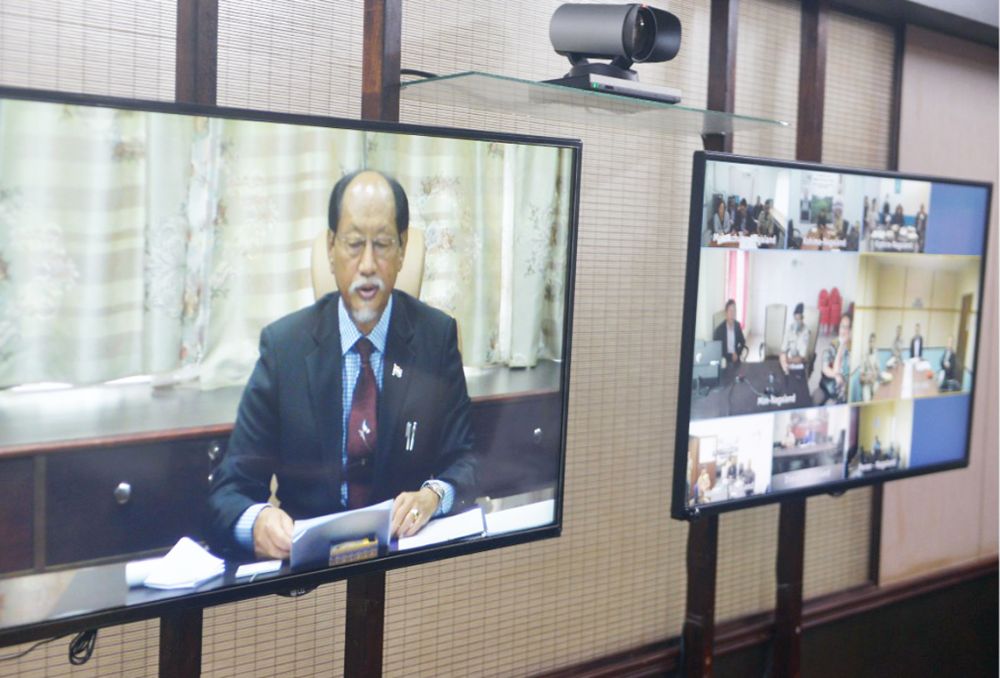 Chief Minister Neiphiu Rio during the video conference on COVID-19 with all the district task forces held at the Chief Secretary’s Office chamber on March 23. (DIPR Photo)
