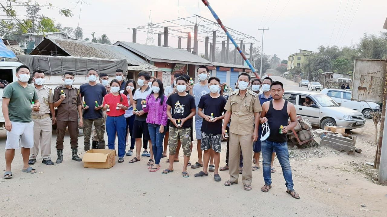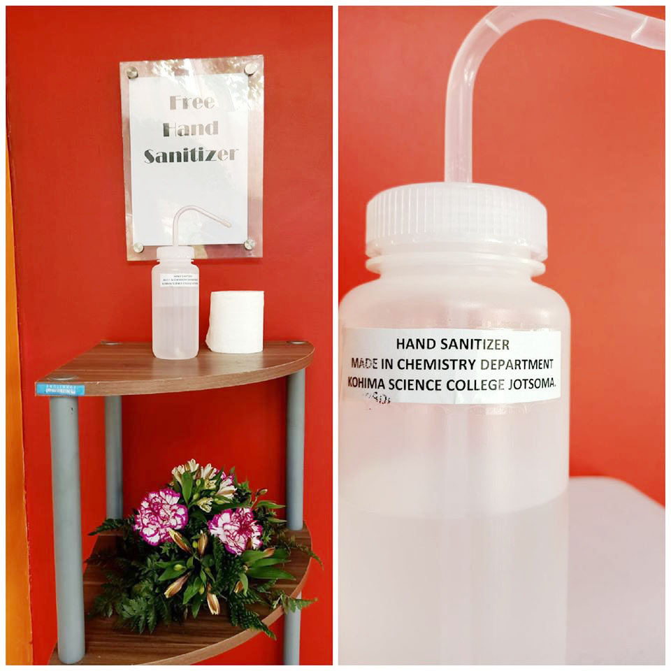 In this photo shared by Task Force for Music and Arts, Nagaland on its official Facebook page on March 16, hand sanitizers developed by Kohima Science College (Autonomous), Jotsoma is seen at the RCEMPA bu