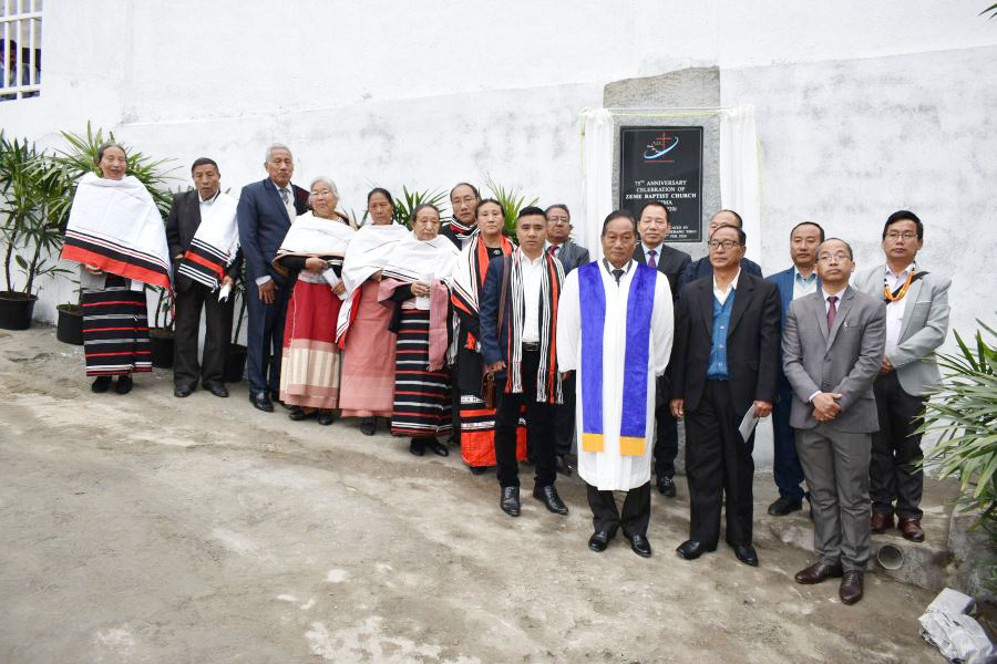 Rev Kuzerang Thou along with pastors, deacons and elders of Zeme Baptist Church Kohima after dedicating the 75th Anniversary monolith at the church compound on February 9.