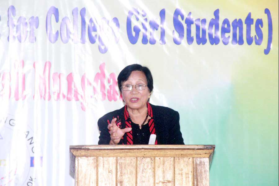 L Opangla, former president Watsü Mungdang speaks during a seminar on women’s rights for college students at Sangtemla Ward Community Hall on February 8.