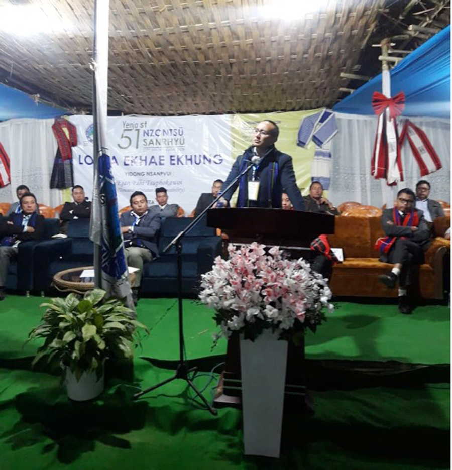 Advisor Mmhonlumo Kikon addressing the last session of 51st general conference of the Lotha Students Union (LSU) at Merapani village (Merachü Yan) on January 28. (DIPR Photo)