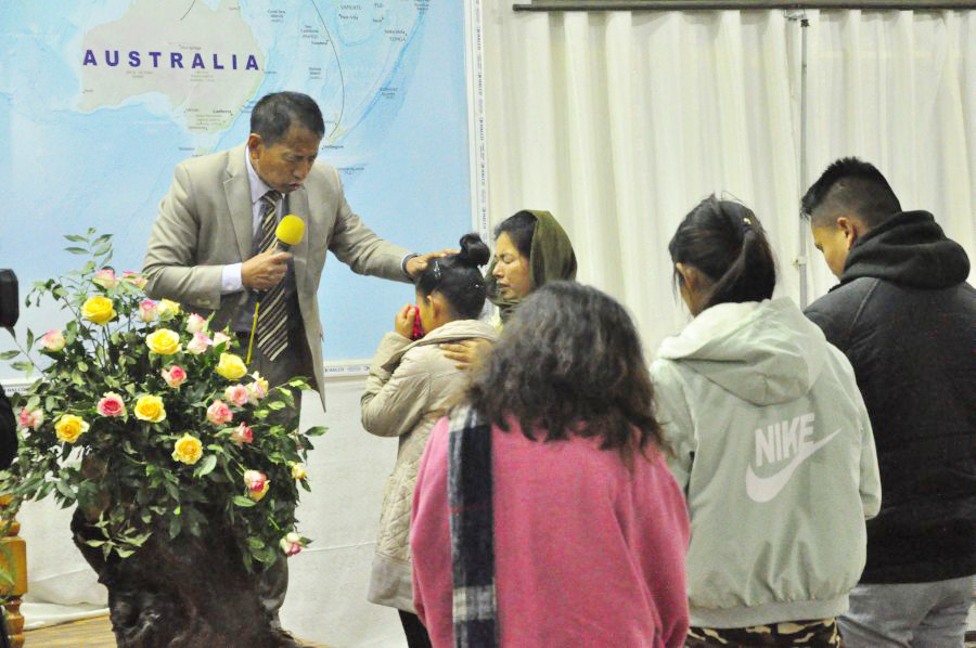 Rev Zotuo Kiewhuo praying for the congregation during the Koinonia Prayer Centre monthly revival programme held from January 10 to 12. (Photo Courtesy: Koinonia Media Ministry)
